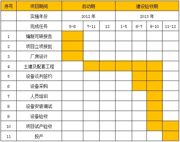 項目總投資主要來自項目發(fā)起公司自籌資金,按照計劃在2012年3月份前完成項目申報審批工作。預計項目總投資資金到位時間在2011年4月底。整個項目建設(shè)期內(nèi),主要完成項目可研報告編制、項目備案、土建及配套工程、人員招聘及培訓、設(shè)備生產(chǎn)、設(shè)備運行及驗收等工作。